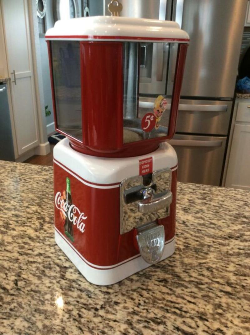 Vintage oak 5 Cent candy gumball Coca Cola themed, very nice!!!! New paint, decals, lock and key, plastic windows have been replaced with glass and they look real nice. Does have small minor pitting on the coin mechanism, nothing major!!…
