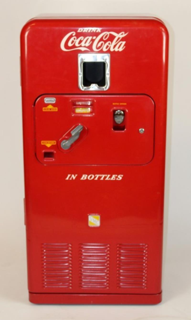 Coca-Cola 10-Cent Coin-operated Bottle Vending Machine, Vendorlator Mfg. Co., Fresno, California, model VMC 33, serial no. 33-40271, in original painted surface. Machine is operable but not tested for full functionality. 52 1/2" H x 25" W x 15 1/2" D.…