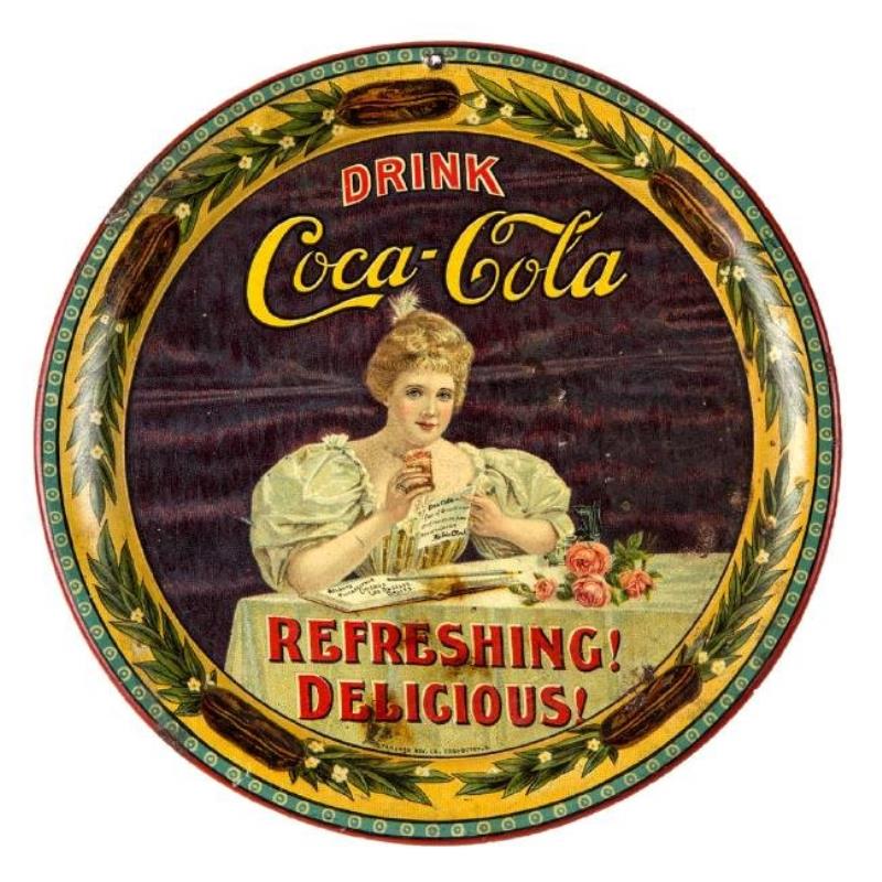1900 COCA-COLA ADVERTISING TIN LITHOGRAPH CHANGE / TIP TRAY, circular, with image of a lady in Victorian dress enjoying a glass of Coca-Cola, lettered "DRINK / Coca-Cola", and "REFRESHING! / DELICIOUS!", with "STANDARD ADV. CO., COCHOCTON, O." at edge of…