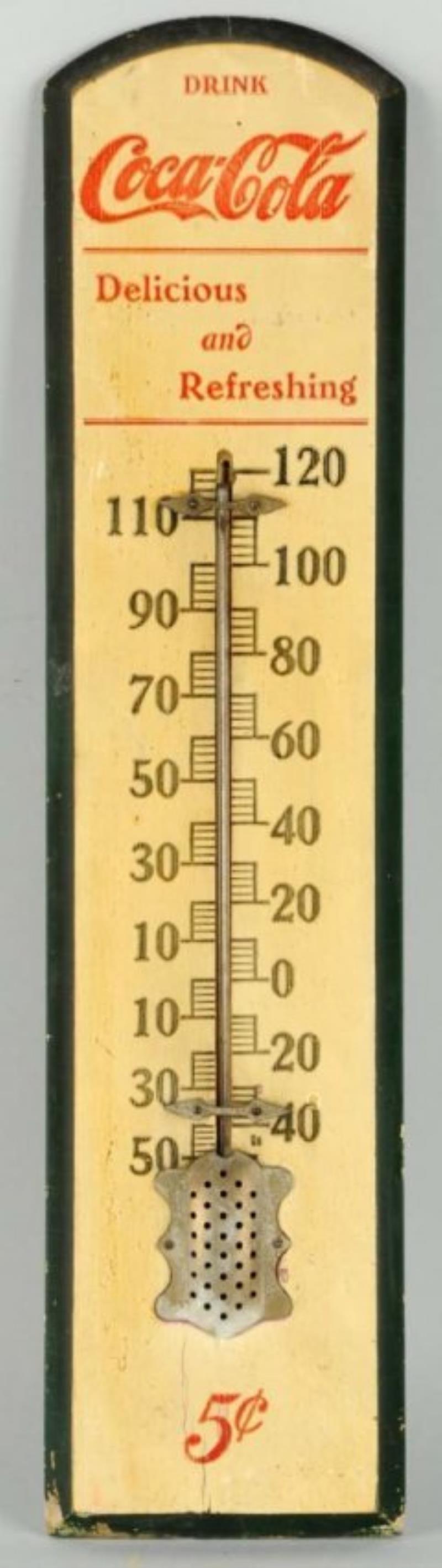 SSW. Lot of two Coca Cola thermometers. The first reads "Drink Coca-Cola 5¢ Delicious and Refreshing", with slight fade to the color, a little paint loss and edge wear, does have a tube present, but it is not currently working.…