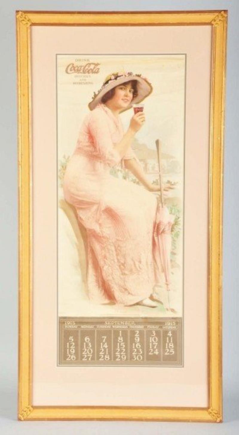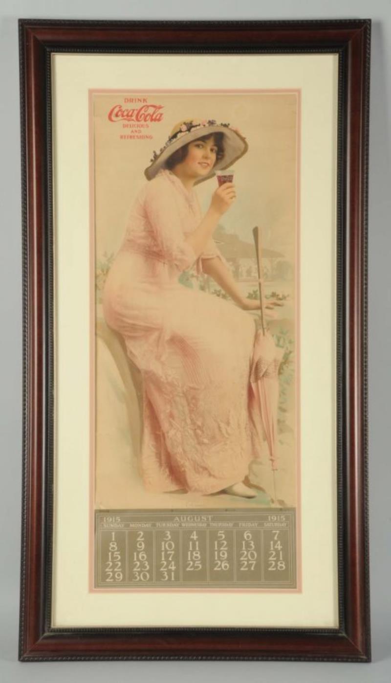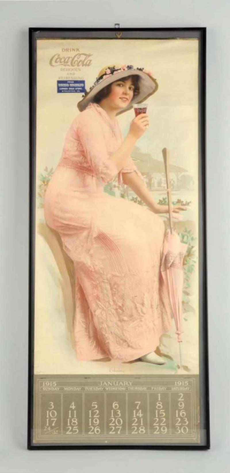 Image is 34 3/4"x 20"; nicely framed under glass; stunning color, graphics and image, especially due to large size; complete with two calendar pages; and also promotes Goldelle Ginger Ale in addition to Coca-Cola; light to medium soiling; with light…