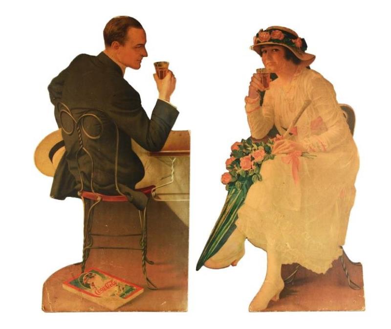 Includes two very elusive pair of window display heavy cardboard signs. The man still retains his easel and the other is missing. Even though the pieces are darkened overall, they still present quite nicely. Otherwise, there are some edge bends,…