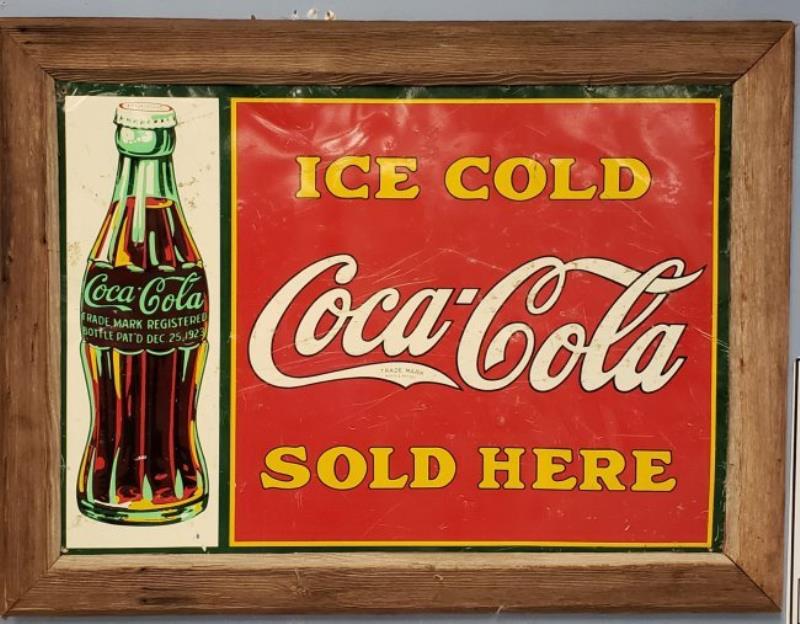 28" x 20" Framed tin sign with the 1923 Christmas bottle, scuffs, scratches, and surface rust.PLEASE READ & UNDERSTAND THE PAYMENT & SHIPPING TERMS FOR THIS AUCTION PRIOR TO PLACING BIDS.