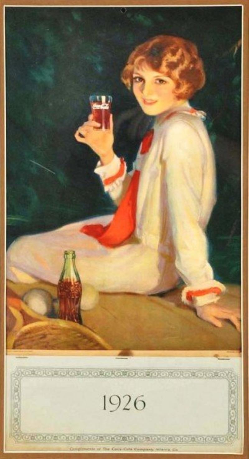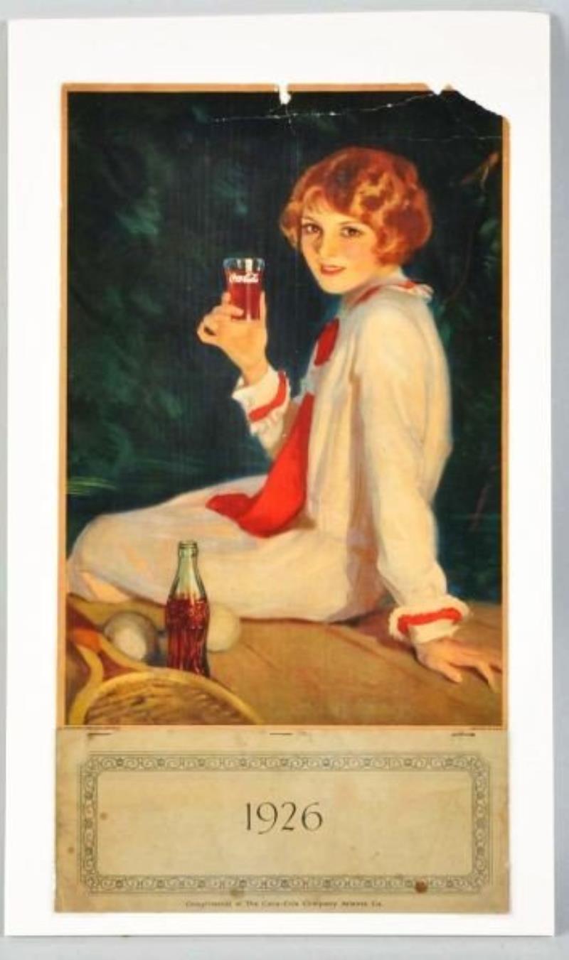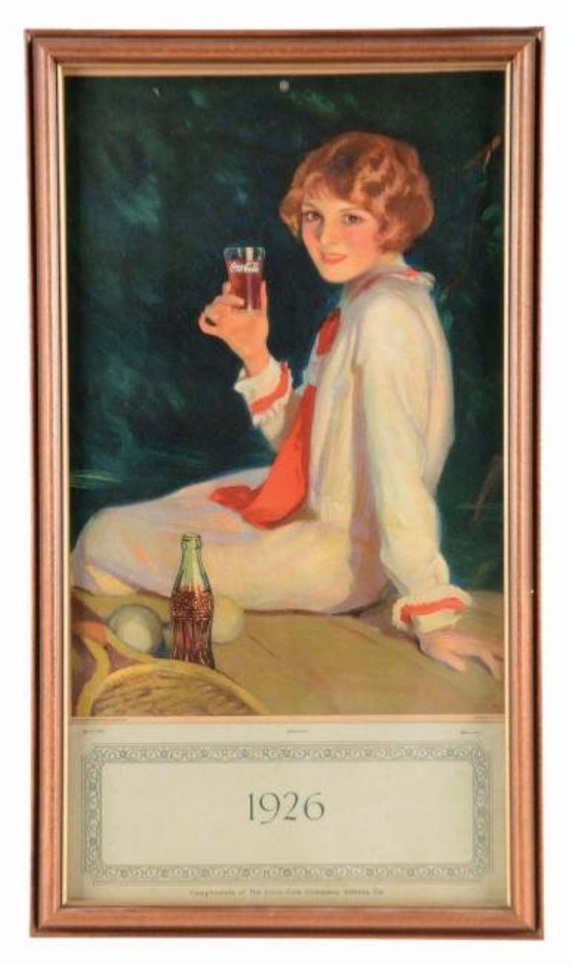 This is a unused 1926 Coca-Cola calendar, marked "Compliments of the Coca-Cola Company, Atlanta, Georgia". Framed under glass with what appears to be a complete pad for the year 1926, depicting a young lady enjoying a bottle and a glass…