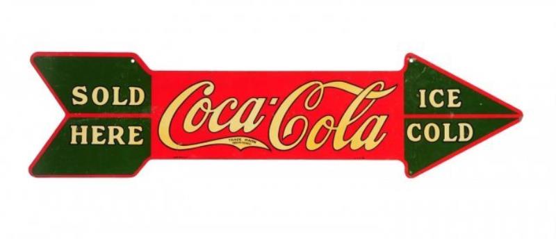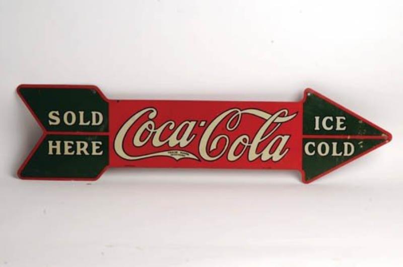 DST. 1920's Coca Cola tin arrow sign. Marked "Copyright 1927". Areas of significant paint loss on edges and back portion of arrow. Some staining and scratching throughout. This is a very unique Coca-Cola sign and very difficult to acquire in…