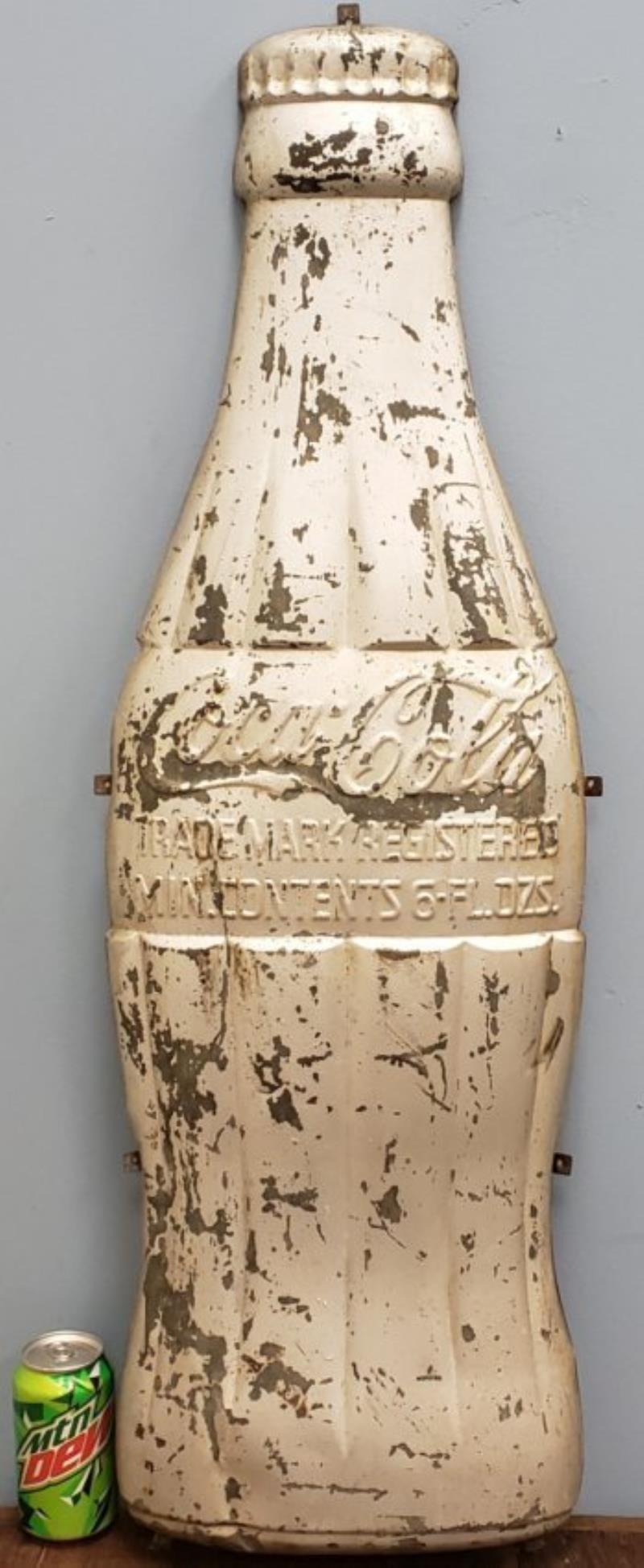 12" x 28" Scarce embossed die cut bottle sign with some paint flaking, scuffs, and a dent at the bottom. PLEASE READ & UNDERSTAND THE PAYMENT & SHIPPING TERMS FOR THIS AUCTION PRIOR TO PLACING BIDS. ALL BIDDERS ARE BOUND…