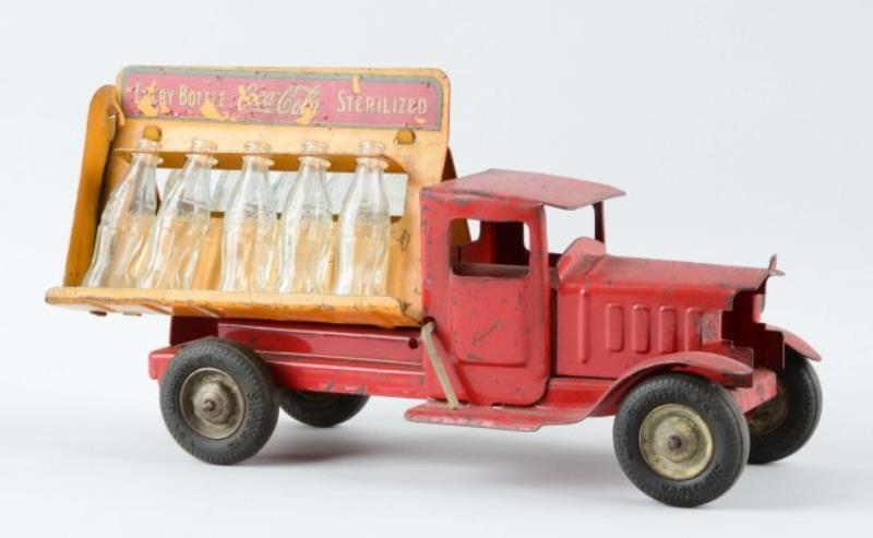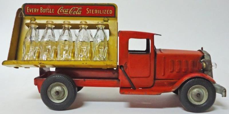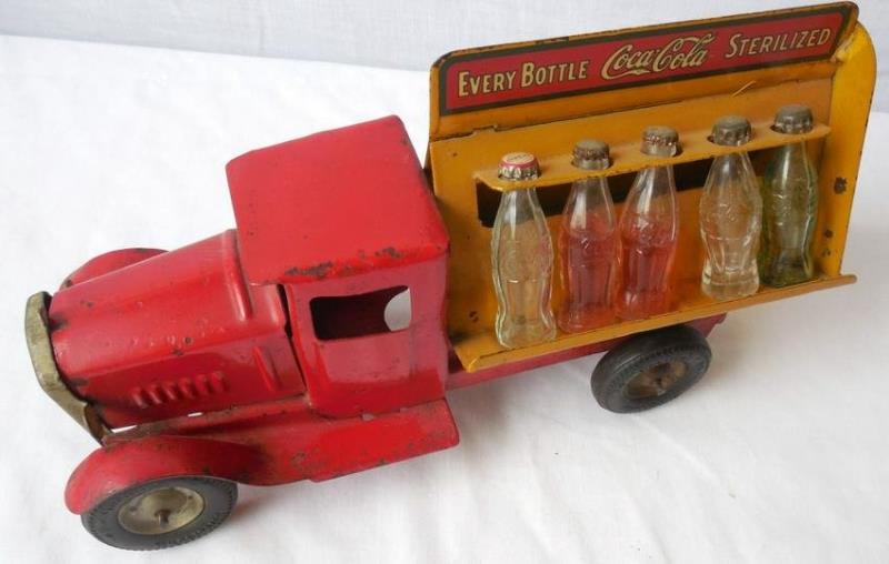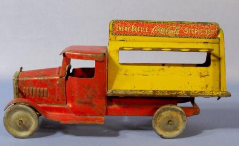 Metal Craft Coca Cola Bottle Delivery Toy Truck: made by Metal Craft Corp of St.Louis. Circa 1931 with metal wheels.(There are no bottles with it. It shows a lot of use in the form of worn and chipped paint, all…