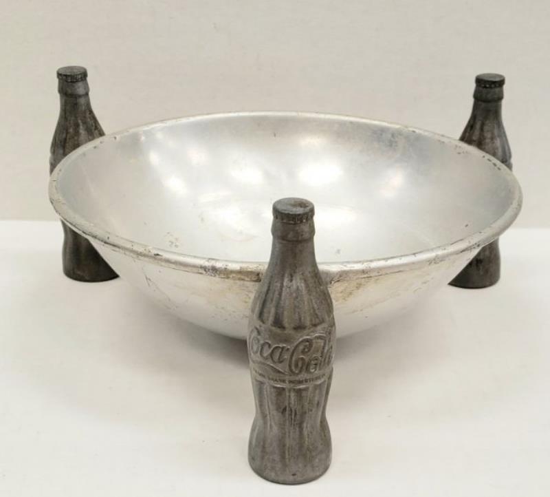 Coca-Cola Pretzel Bowl. 1930s. Aluminum bowl with three cast Coke bottles at perimeter. Diameter 8”.