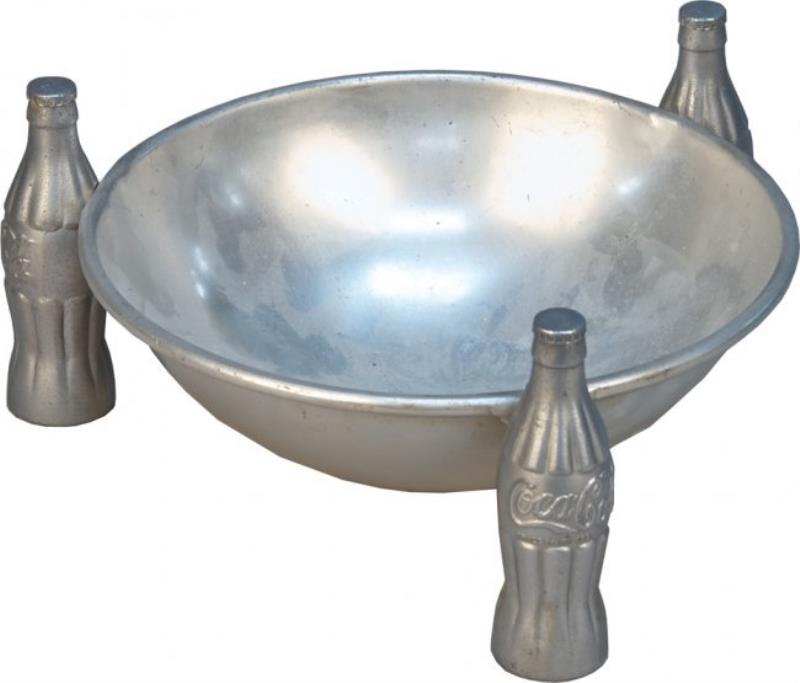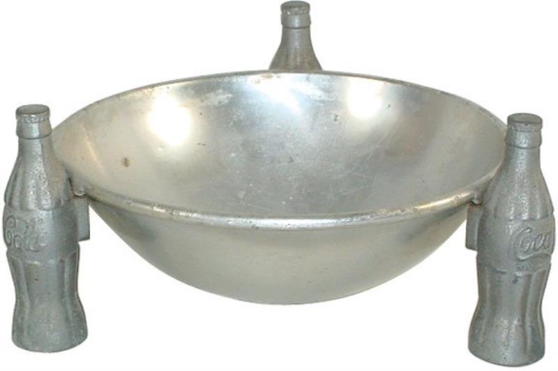 Coca-Cola Pretzel Bowl. 1930s. Aluminum bowl with three cast Coke bottles at perimeter. Diameter 8”.