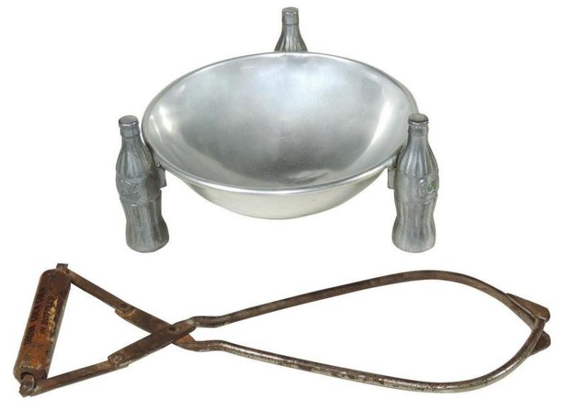 Coca-Cola 1930's aluminum pretzel dish & 1920's ice tongs marked "Refresh Yourself Drink Coca-Cola in Bottles-Lincoln, Nebr", both VG cond, 9"Dia & 14"L.