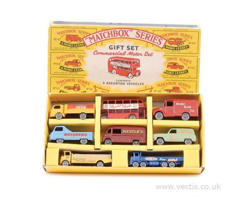 Matchbox Regular Wheels No.G1 "Commercial Motor" Gift Set comprising of No.5b London Bus "Players Please", No.20b ERF "Ever Ready For Life" Truck, No.37b Karrier Bantam "Coca Cola Delivery Truck", No.47a Trojan "Brooke Bond Tea" Van, No.51a Albion Chieftain "Blue Circle…