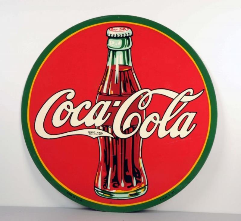 Round sign shows an image of a Coke bottle, circa 1934. Appears to be NOS. Condition (Near mint). Size 45 1/2" across