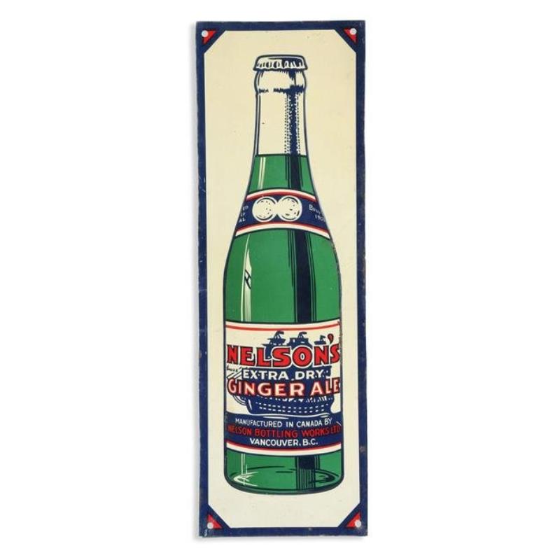 Canadian. Lithographed tin. Embossed bottle graphic. 13" x 4.5". Light rippling along edges. Minor surface scratches along the right edge of the bottle graphic. Excellent colour and gloss. Free of restoration. Patrick Roy Collection. Est. $200 - 300
