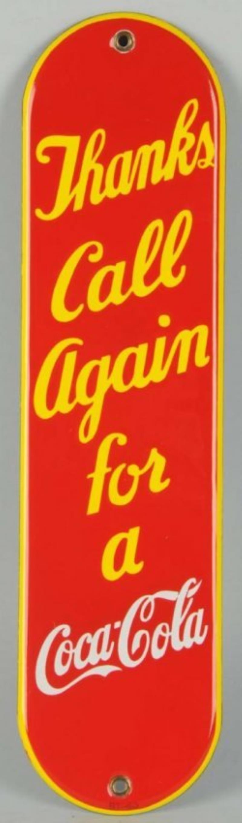 This Porcelain, “Thanks, Call Again For A Coca-Cola” Door Push is in excellent condition. The field of this piece is in excellent condition, and has superior color & gloss, as well as the original grommets. The outer edge does have…