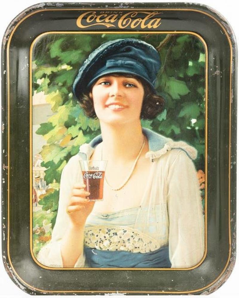 Coca-Cola "Autumn Girl", Lovely Antique Rectangular Serving Tray ca. 1922. One of the six beauties featured on Coca-Cola trays from 1920-1925 with this model referenced as "Autumn Girl" or also, "Navy Girl" due to the style of the hat. 13ΒΌ…