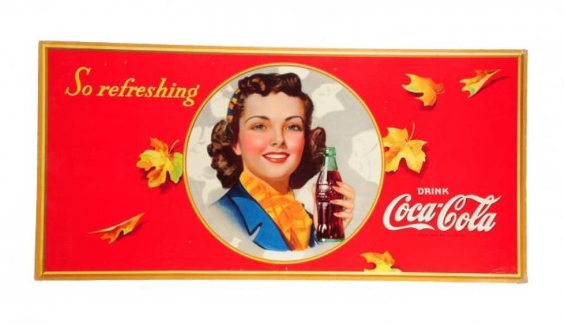 1941 Coca Cola Autumn Girl Cardboard Sign. Staple holes in 5 areas around perimenter otherwise excellent condition. Framed under glass. 15 1/4 X 26 1/4 inches image only.
