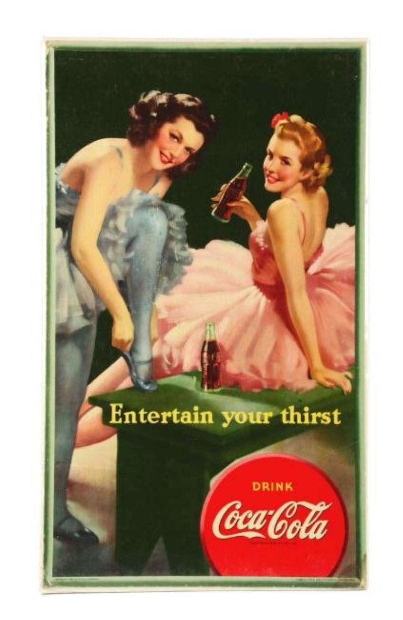 Coca-Cola Sign, Ballerinas, litho on cdbd by McCandlish-Phila, c.1942, VG+ to Exc cond w/minor corner & edge wear, field is Exc, 27"H x 16"W.