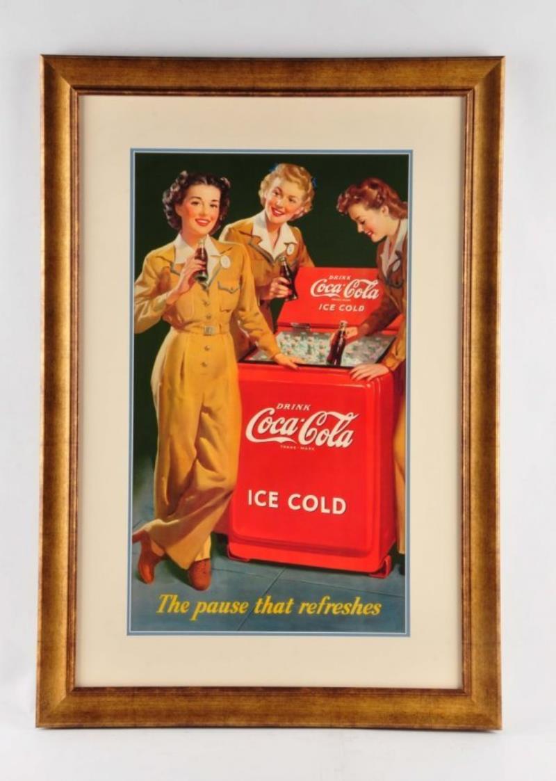 This professionally framed sign is in great condition and has a great graphic showing three women standing around a cooler drinking coke. Condition (Near Mint). Size 35 -1/4" x 24 -1/2".