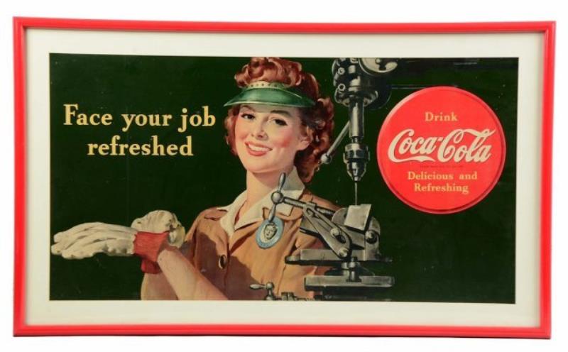 Sign is professionally framed behind glass and shows a woman factory worker standing at a drill press. Sign is titled "Face Your Job Refreshed" The colors are slightly faded. There are some closed tears and punched holes as well as…