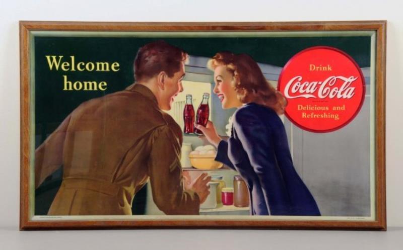 Coca-Cola Sign, "Mind Reader", WWII era Naval-Inspired cdbd litho, Fair cond, margins w/wear & losses, scattered stains & early repairs/touch-ups, laid down on mount board w/mat, 31"H x 59"L.
