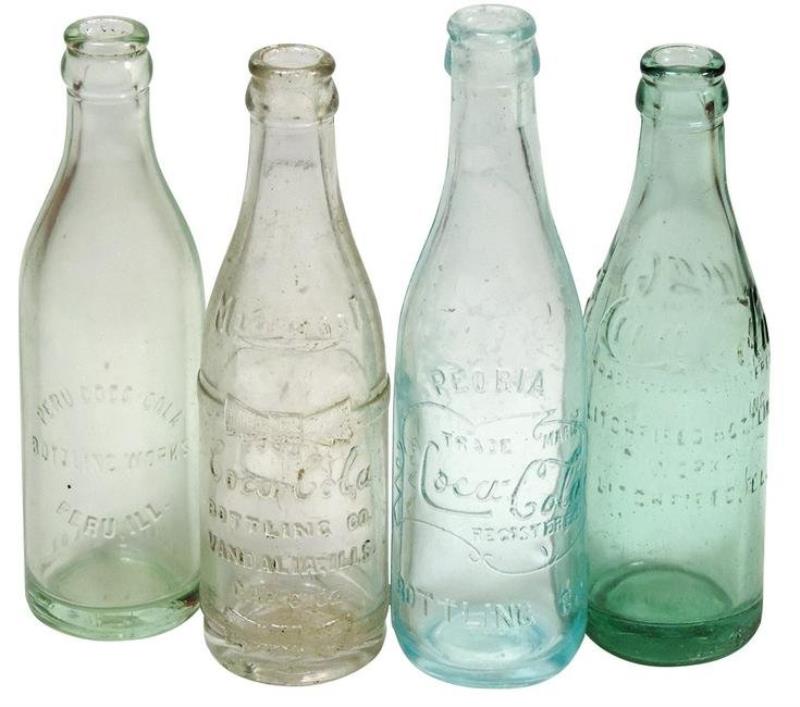 Coca-Cola bottles (4), clear/light green, embossed Peoria, ILL (chip on lip), Litchfield, ILL (Exc), Peru, ILL (Exc) & Vandalia, ILL w/bowties on front & Purity on back (lg chip on base), all approx 8"H.