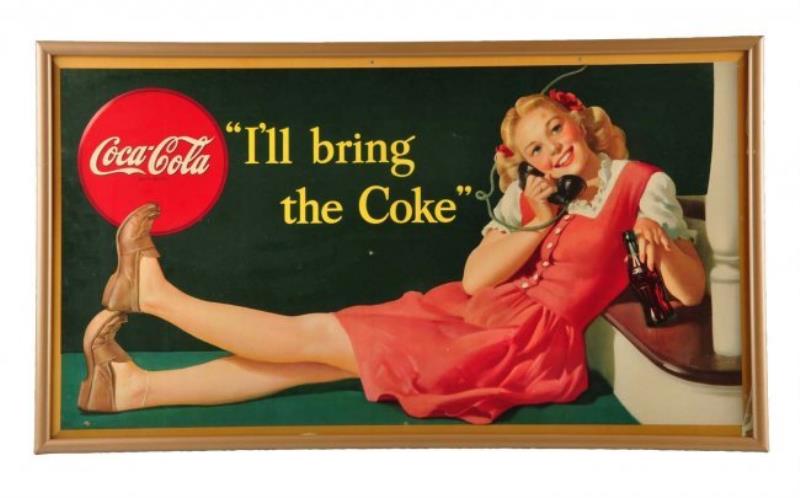 1946 Coca Cola Cardboard Sign. Depicting young girl on the phone, "I'll bring the Coke". Nail holes and tears around perimeter, pen mark "1945" in bottom right corner. 56 1/2 X 27 1/4 inches.