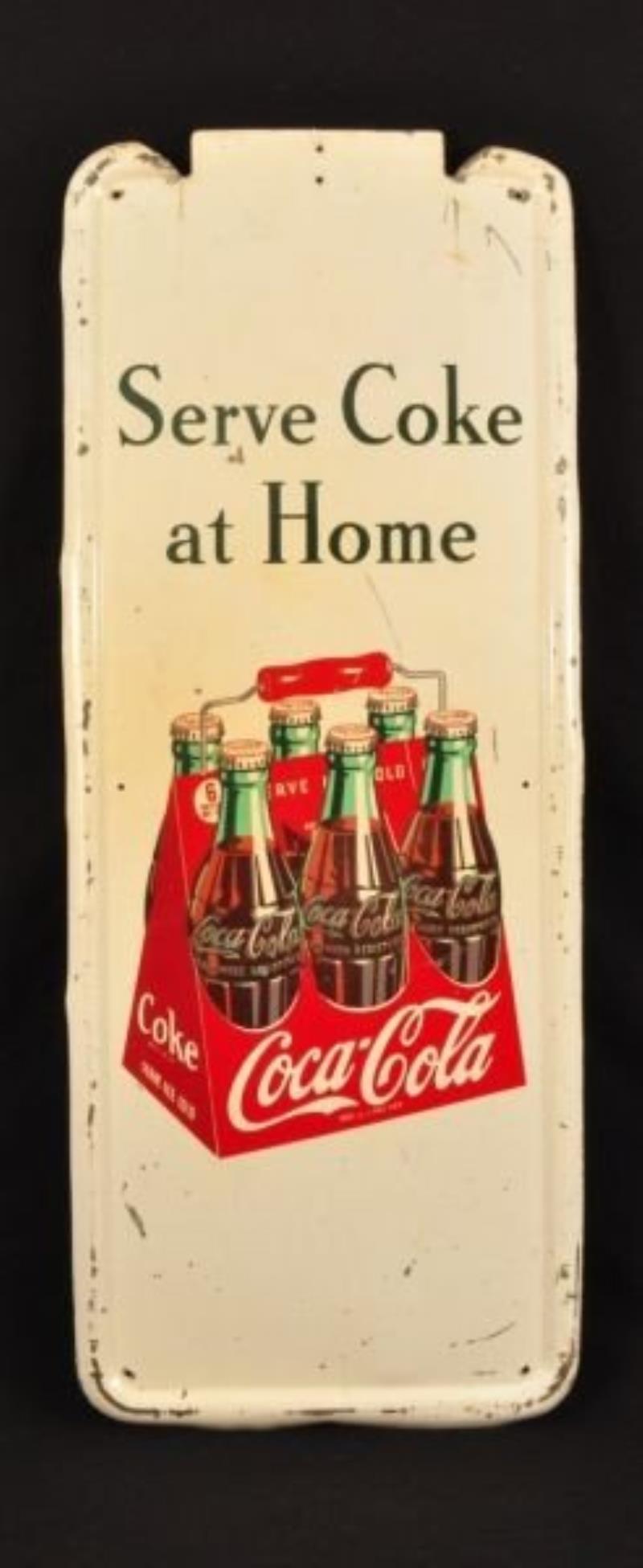 This is an outstanding example of this large size Coca-Cola die-cut six-pack bottle sign, marked "AM 23". The sign is fully embossed with some areas of light scratches around the word "Size" at the bottom, an area of a light…