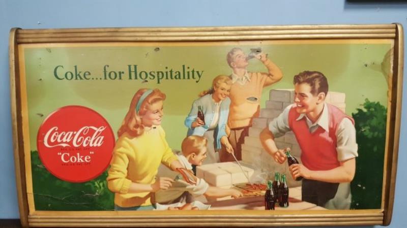 58"w x 31"h Original Coca Cola Cardboard sign in Coke frame. Showing boys and girls having a cookout.