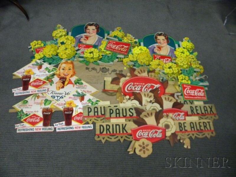 Four Coca-Cola Die-cut Cardboard Festoons and Backbar Display, a Wood Flower, two Verbena, and a State Tree, with original wraps, (imperfections, damage).