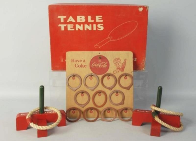 Group of Coca-Cola "Games for Young America" and Other Coca-Cola Games and Toys, 1930s-1970s, including Chinese checkers, a dart board, ping pong paddles, a Styrofoam glider, checkers/dominoes/backgammon, tick-tack-toe, anagrams, ring toss, a jigsaw puzzle, cribbage, chess, etc., many by Milton…