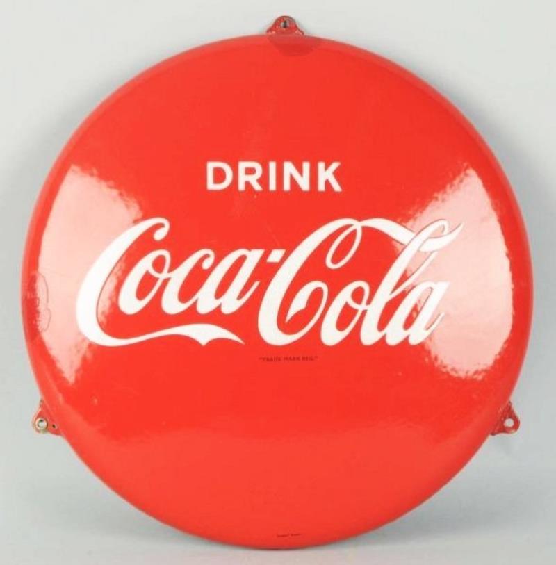 SSP. Lot of two Coca Cola signs. The first is a Coca-Cola script red and white button in very good condition with strong colors and gloss. One hanging tab is pushed back. A very hard to find piece that will…