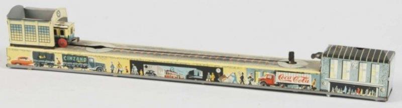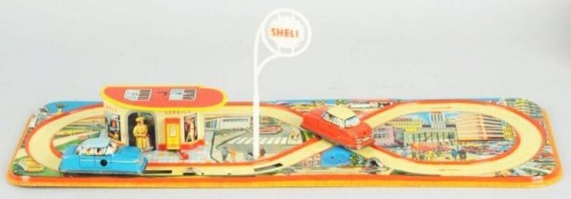 Includes colorful original box, with some minor creasing and wear. Box shows the Coca-Cola plant in distance. Nicely tin lithographed track with two small wind-up vehicles. Includes Shell sign. With original key.Condition (Very Good - Excellent). Size Box: 20" L.
