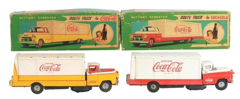 Coca-Cola Toy Truck w/Box, battery-operated Route Truck, yellow & white litho on tin by Sanyo-Japan, c.1950s-60s, truck in Exc cond, box in VG cond w/some edge wear, 13"L.