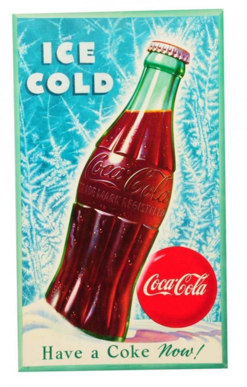Vertical, double sided; "Have a Coke Now" with image of dart board; "Ice Cold" with image of bottle in frost; aluminum frame; minor wear; overall 30" x 18",