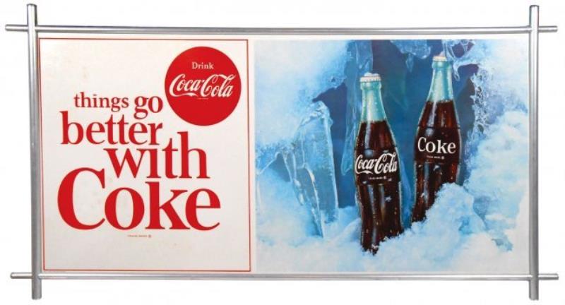 Coca-Cola sign, "things go better with Coke" 2-sided cdbd sign in orig aluminum frame, one side pictures pretty girl on telephone, other side pictures frosty bottles of Coca-Cola, both sign & frame are NOS in Near-Mint cond, 32"H x 61"W.