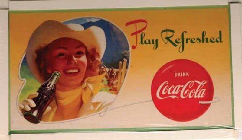 The offset litho on cardboard graphics of 'Play Refreshed,' copyright dated 1951 lower left, signed McCandlish; the opposite side with bottle, button and silhouettes of Americans at work and play. Signed Lithograph Corporation lower right, Petretti #PCS216.000.Sight size is 18…