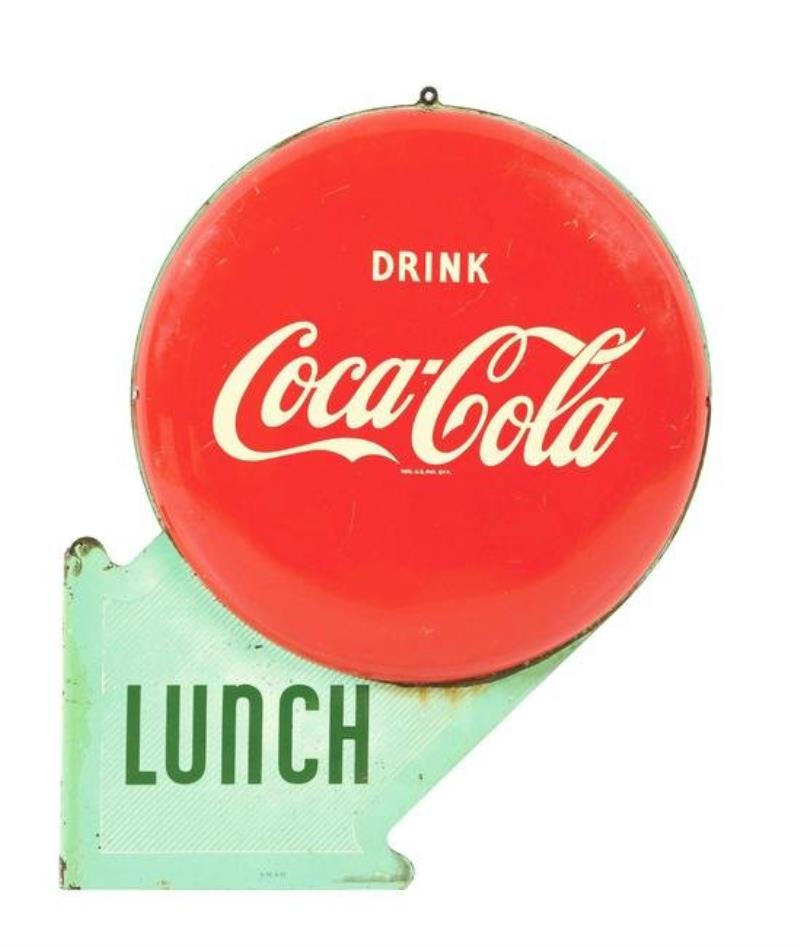 DST. 1950's Coca Cola "Lunch" flange sign. Light touch-up paint to flange portion of the sign. Both buttons have slight surface scratching throughout the field. Both buttons marked "A&M Sign Co." as well as the body of the sign. Overall…