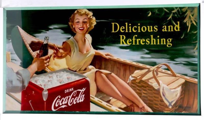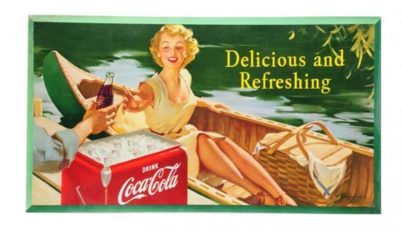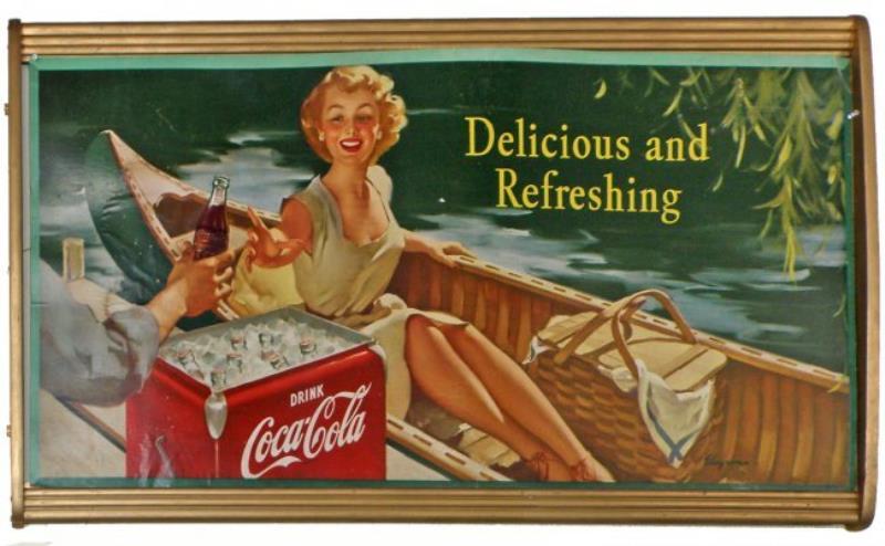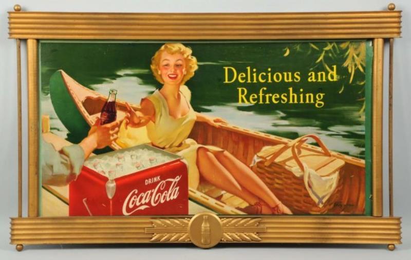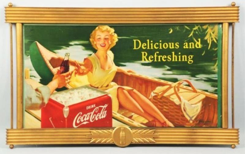 40.5\" x 24.5\" 1953 framed Coca Cola cardboard sign with girl in a canoe reaching for a coke. Gil Elvgren is the artist.