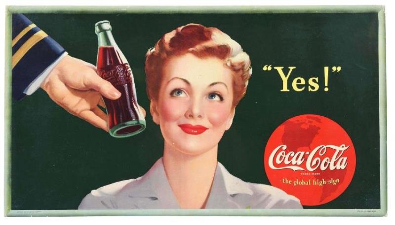 Sign is dated 1944 and was made by Forbes in Boston. The colors and graphic are very strong. It is titled "Yes". There is damage on all four corners with some light abrasions in the field.Condition:(Very Good).Dimensions36" x 20".Condition:(Very Good).Dimensions36"…