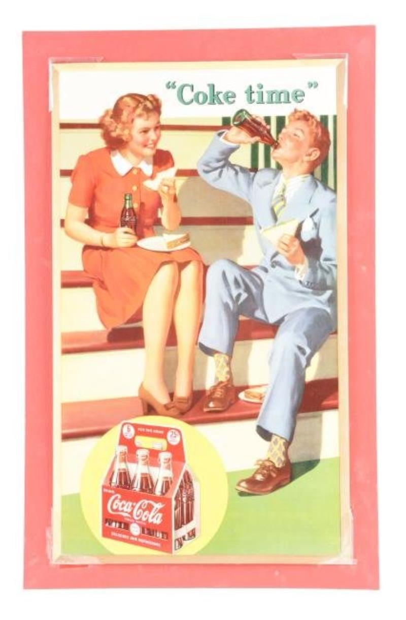 Sign was made by Edwards & Deutsch Litho Company, Chicago. The sign has very strong colors with a great graphic showing a young couple enjoying some Coca-Cola. There is some light corner wear on the left side top and bottom.…