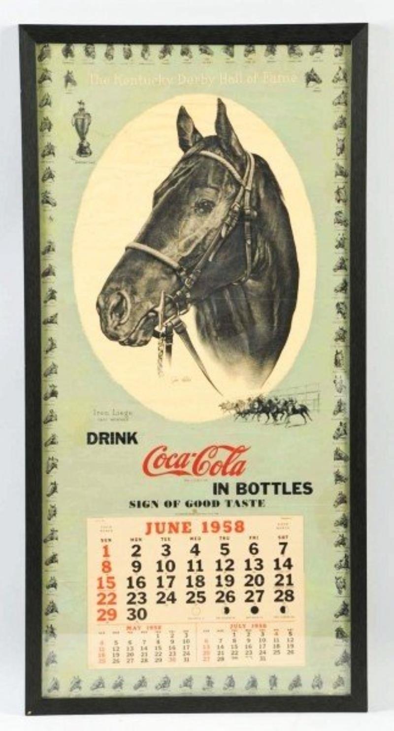 Framed under glass. Unusual calendar with Kentucky Derby Hall of Fame horses shown around the border. Features Joe Petro (horse) in center insert. Medium to heavy wear, fold marks, a few closed tears, some minor stains, and mild discoloration.Condition (Good…