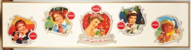 Festoon is professionally framed. This is a very detailed piece showing 3 smiling women holding their umbrellas with coca cola glasses in their hands. There is some mild edge wear, a few fold lines, and some spotting on the middle…