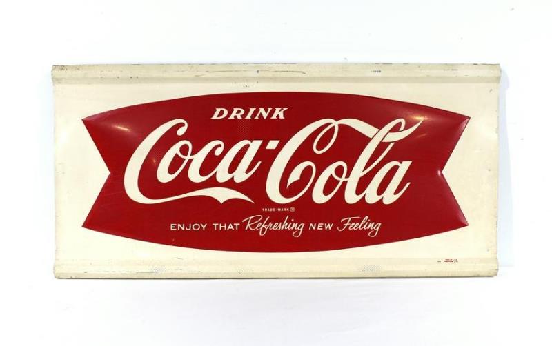 Coca-Cola Fishtail Tin Advertising Sign - Offered Without Reserve - Vintage Original Coca-Cola Fishtail Tin Advertising Sign. Good color and gloss. Has some wear and scratches. Displays well. Measures 17.5" x 53"