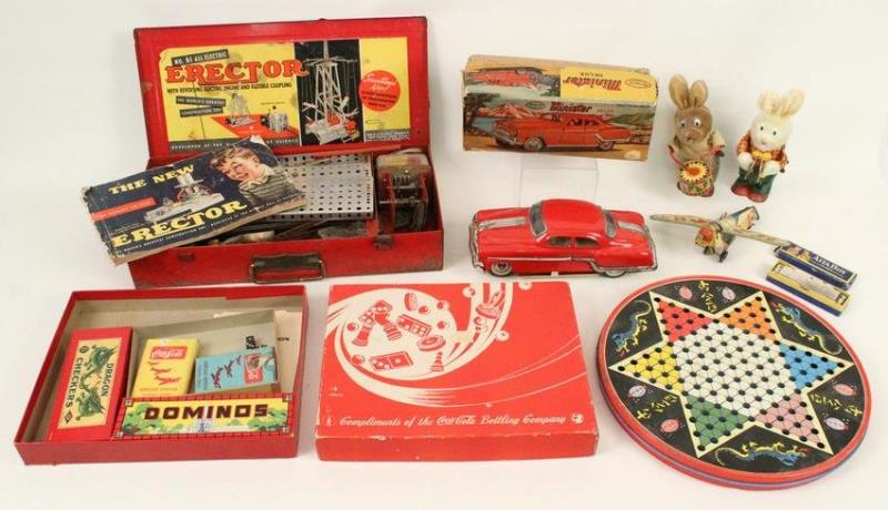 Group of Children's Toys & Games, Including Coca-Cola Set, Airplane, Model Car, Etc. (1) Japanese Friction tin car in the original box. Measures 9" x 3 1/2". (1) Chinese checkers game with some marbles. (1) Coca-Cola game box with checkers,…