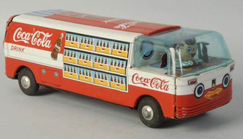 Coca-Cola Toy Truck w/Box, Japanese Soda Car Series, litho on tin w/friction motor, c.1960s, headlight "eyes" & driver's head move back & forth as truck moves forward, truck in Exc cond w/a few light age scratches, box in Exc cond,…