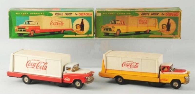 Soda Delivery Friction Power Tin Toy Trucks. Coca Cola Soda Car Series in original box. 7-up and Pepsi Cola. Taiyo Toy World, made in Japan. 8 3/4 inches long.