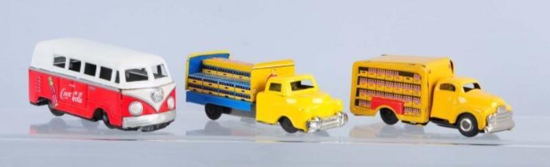 This lot includes three small friction powered Coca-Cola toy trucks. Condition (Very Good Plus). Size Largest: 4" L.