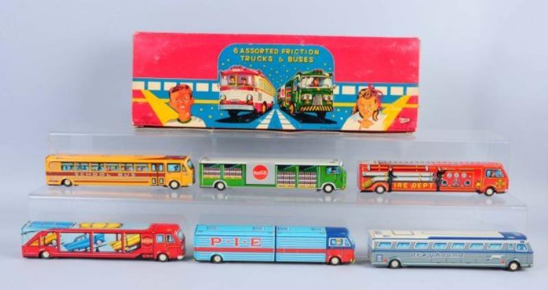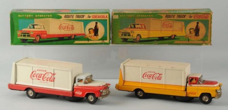 This boxed set of tin trucks includes a Coca - cola truck. Condition (Excellent). Size 18" L.