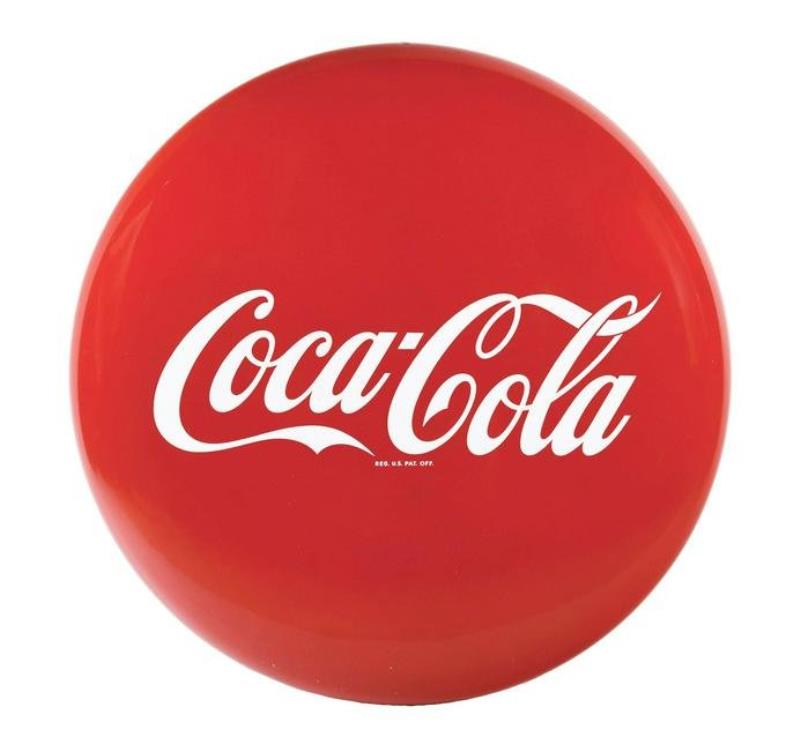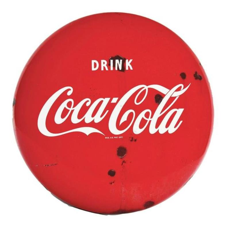 SSP. 1950's Coca Cola porcelain button sign. Slight surface scratching in the field, chips at the mounting holes, minor browning and color stains throughout on the edges. Overall, the piece still displays beautifully. Condition: (7.5). Dimensions: 24" x 24" x 2 - 3/4".