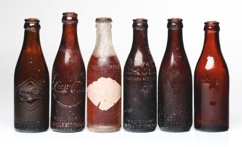 This lot includes five amber Coca-Cola bottles and one Koca Nola bottle. The Coca-Cola bottles are from Toledo, Ohio, Philadelphia, Pa, Jackson, Tenn, Memphis, Tenn and Dayton, Ohio. The Memphis bottle has the rare arrow designs on both sides. Also…
